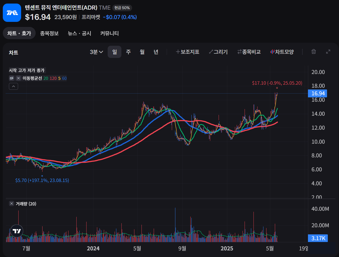 - 주가가 52주 최고가(17.05 USD)를 돌파할 경우 일부 수익 실현을 고려합니다