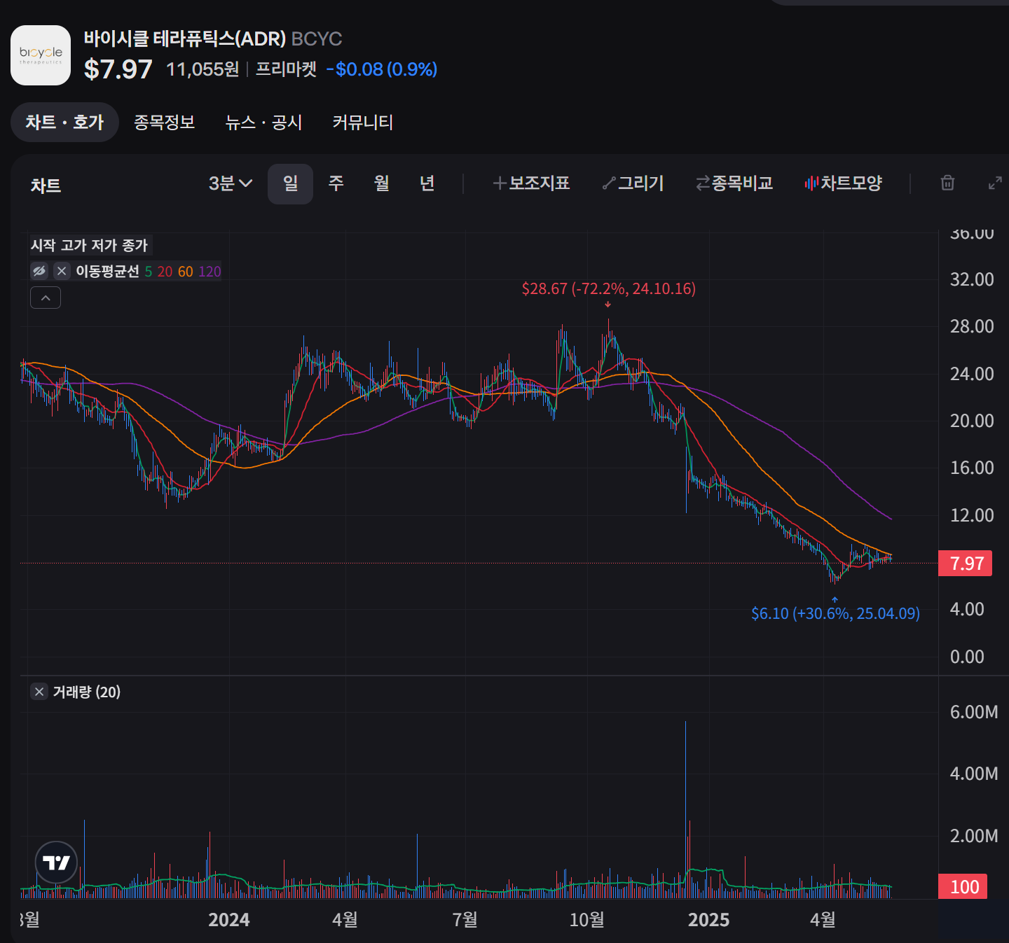 - 현재 주가(8.51달러)는 52주 최저치(6.10달러)에 가까워 진입 시점으로 적절할 수 있으나, 바이오텍 특성상 임상 결과에 따른 변동성이 큽니다