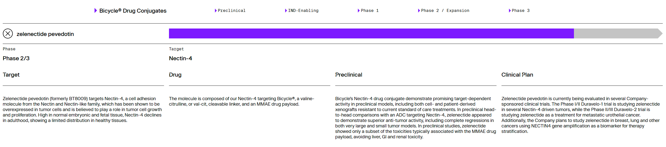 가장 진전된 파이프라인은 Zelenectide Pevedotin(Zele, 이전 코드명 BT8009)으로, Nectin-4를 표적으로 하는 PDC(Peptide Drug Conjugates) 약물입니다