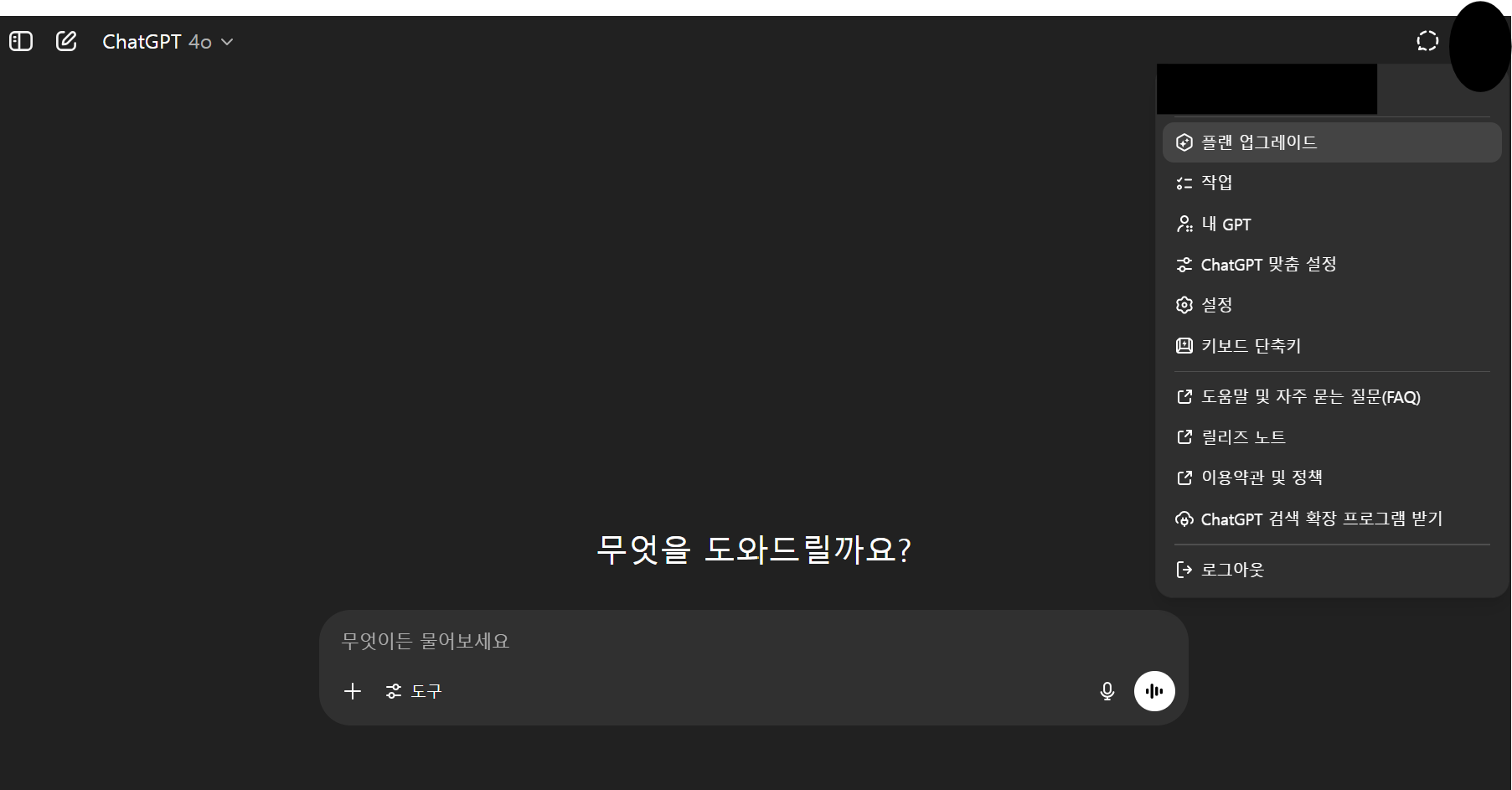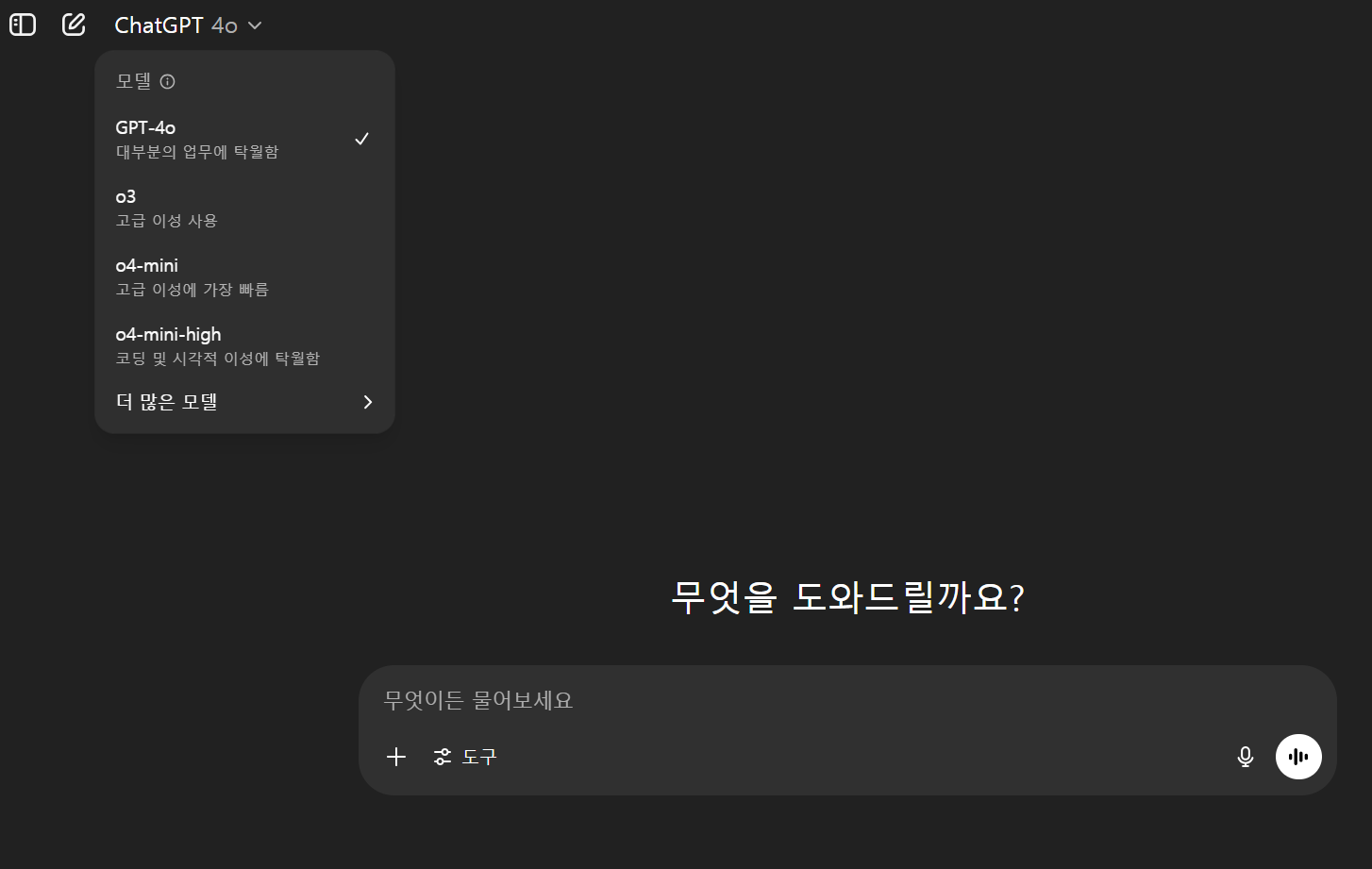 구독이 완료되면 상단의 모델 선택 드롭다운에서 GPT-4나 GPT-4o를 선택할 수 있게 됩니다. 이때부터 Plus의 모든 기능을 자유롭게 사용할 수 있습니다.