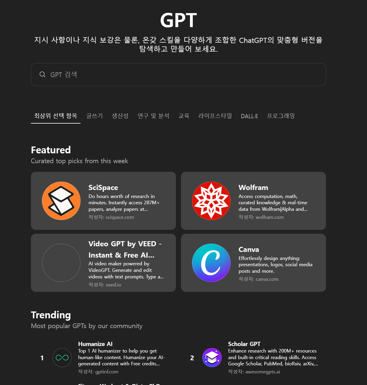 커스텀 GPT는 GPT 스토어에서 다른 사용자가 만든 것을 사용하거나, 직접 만들어 공유할 수 있습니다 모든 기능이 기존 채팅 인터페이스 안에 자연스럽게 통합되어 있어 별도의 학습 없이도 쉽게 활용할 수 있습니다