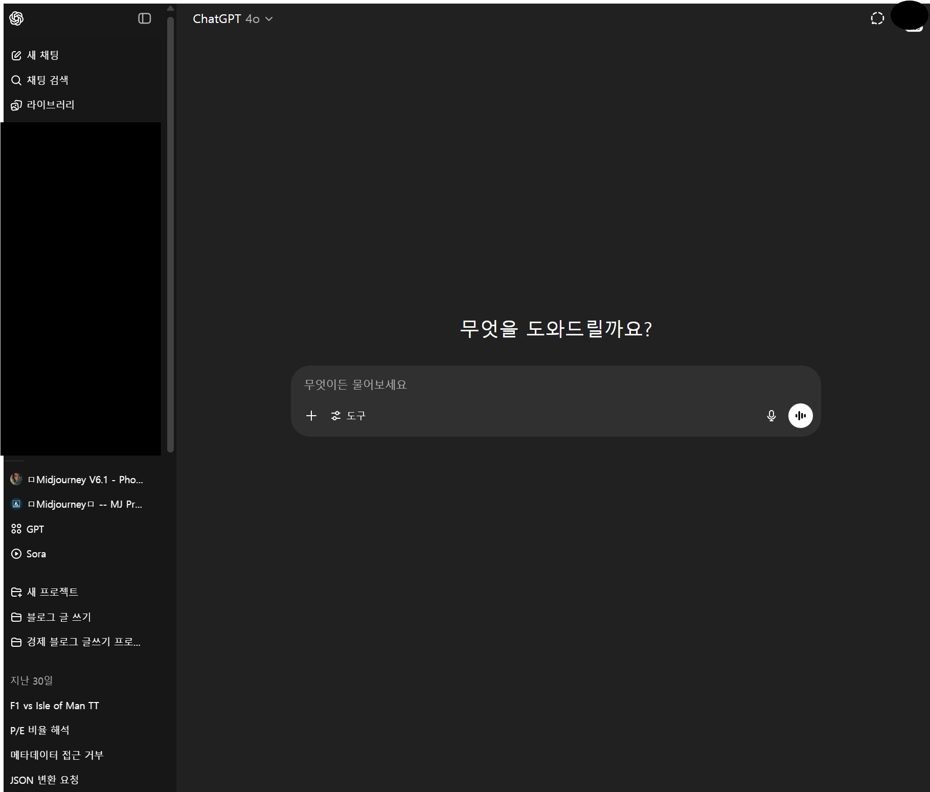여기서 GPT-4o, GPT-4, 임시 채팅 등 다양한 옵션을 선택할 수 있습니다