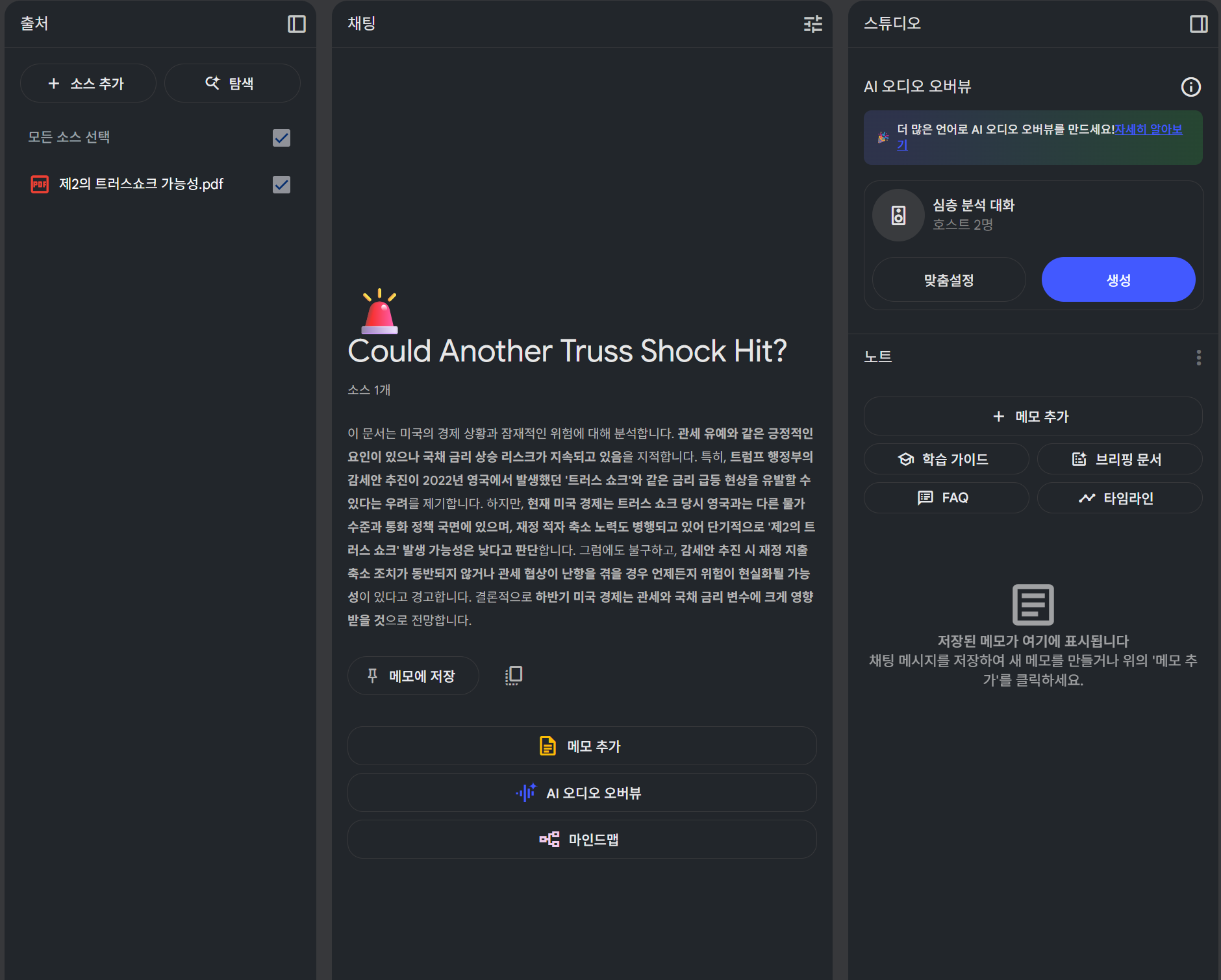 - 업로드 후 시작만 해도 문서에 대하여 요약이 생성됩니다. 제안 질문, 오디오 요약 등을 활용해 원하는 정보를 얻고, 직접 질문하거나 노트를 저장·재구성합니다