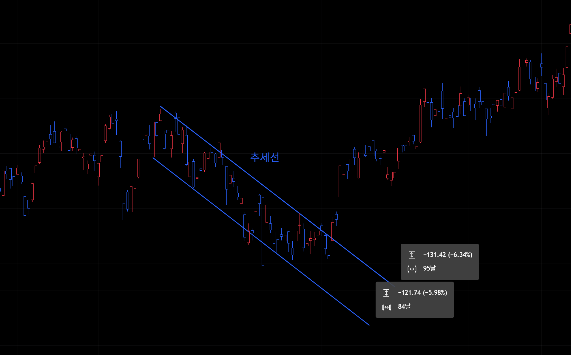 - 추세선: 상승 추세에서는 저점들을 연결하여 상승 추세 지지선을 그리고, 하락 추세에서는 고점들을 연결하여 하락 추세 저항선을 그릴 수 있습니다. 가격은 종종 이 추세선에서 지지 또는 저항을 받으며 추세를 이어갑니다