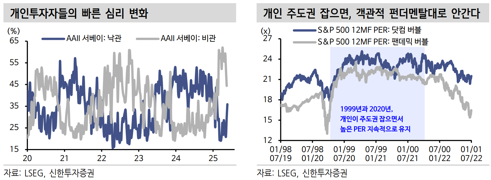 특히 자사주 매입은 관세 전쟁 우려가 고조됐던 지난 3개월간 집중되며 주가 바닥을 형성하는 데 크게 기여했습니다. 개인투자자들 역시 빠르게 낙관적인 심리를 회복하며 반등을 주도했죠. 개인이 시장 주도권을 잡았던 1999년이나 2020년처럼, 시장 가격이 객관적인 펀더멘탈대로만 움직이지 않을 수 있다는 점을 시사합니다