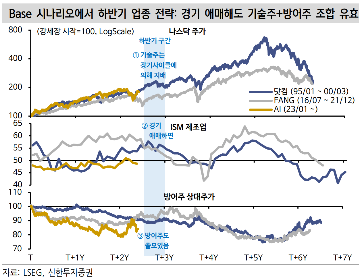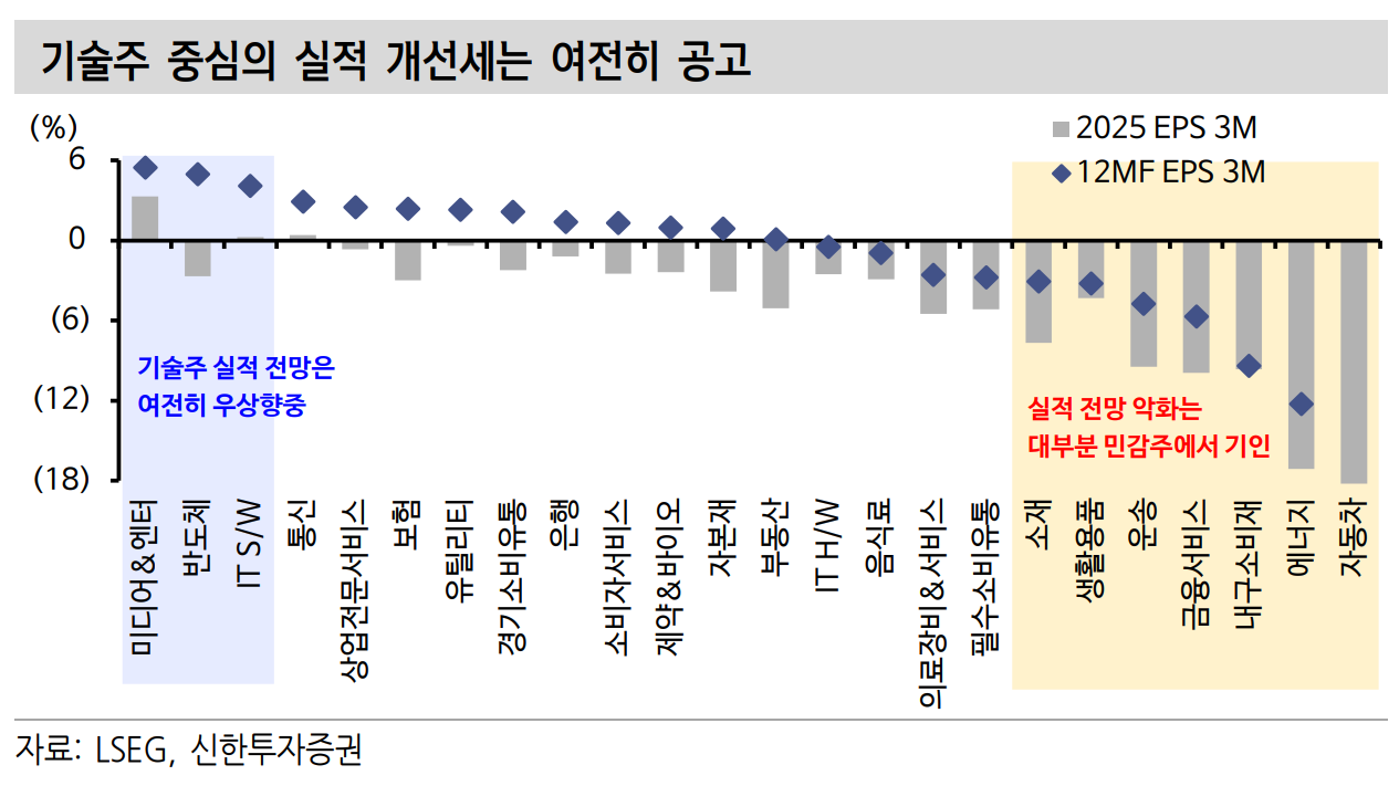 다만, 소비 경기에 노출되는 일부 초대형 기술주(Magificent 7 등)보다는 중대형 기술주가 유효할 수 있습니다. 방어주 중에서는 경기 불확실성 속에서도 상대적으로 안정적인 음식료, 통신, 유틸리티를 바벨 전략의 다른 한 축으로 가져가는 것이 좋다고 봅니다