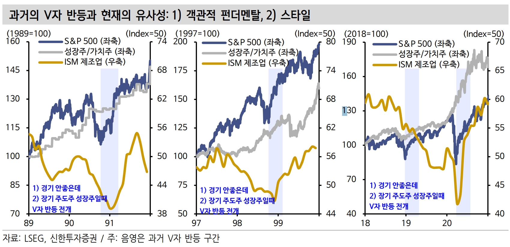 이 시기들은 모두 기술주가 시장을 주도하는 가운데, 객관적인 경기 펀더멘탈은 여전히 불확실했다는 공통점을 가집니다. 급락을 유발한 악재가 제거되거나 강력한 부양책이 나올 때 V자 반등이 나타나는 경향이 있었습니다