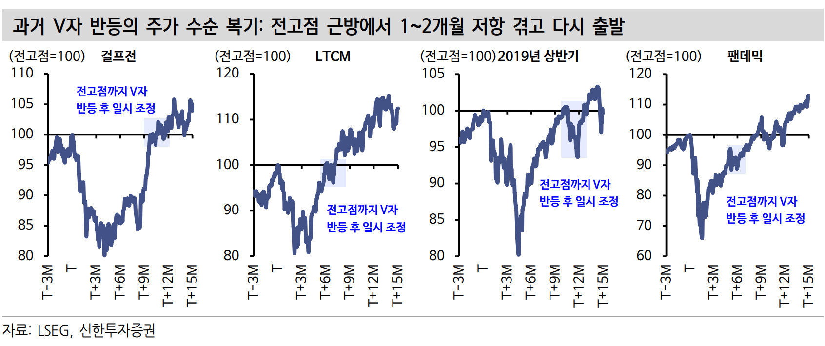 과거 사례들을 복기해 보면, 주가는 저점에서 전고점(이전 최고점) 근처까지 빠르게 회복한 후, 전고점 부근에서는 1~2개월가량 숨 고르기를 거치는 모습이 일반적이었습니다. 이 기간 동안 주가는 4~8% 정도의 조정을 겪었지만, 이후에는 다시 기술주 중심의 강세 추세가 이어지는 패턴을 보였습니다