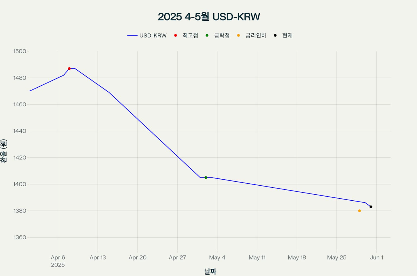 2025년 4월부터 5월까지 달러원 환율의 일별 추이와 주요 이벤트