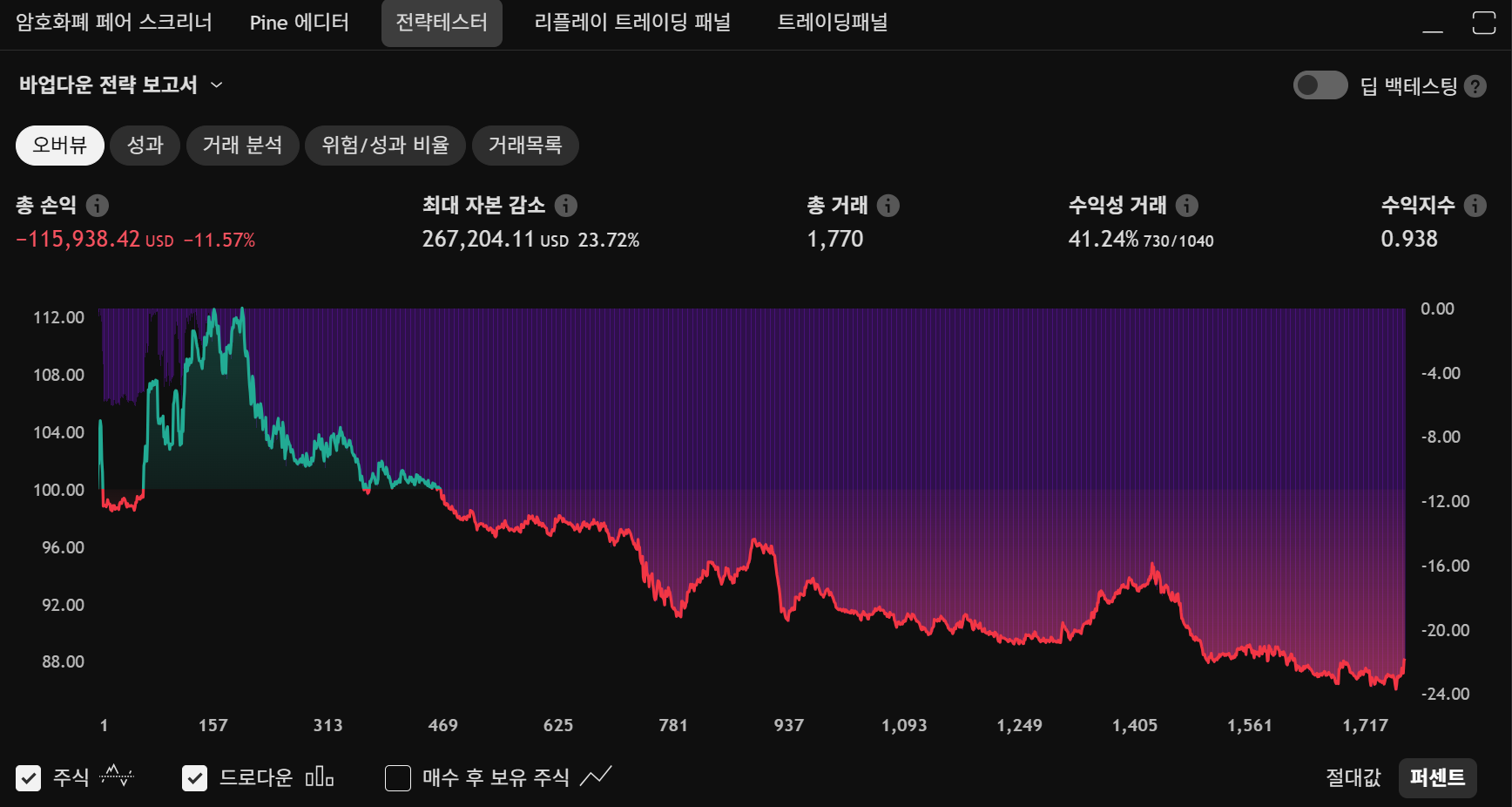 - 전략 설정: 포트폴리오의 10%를 각 거래에 사용하도록 설정