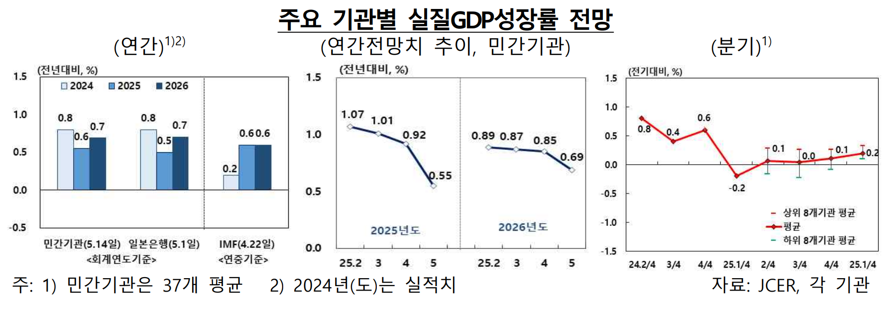 일본은행은 미국의 관세 정책 등을 고려하여 2025년도 성장률 전망을 0.5%로, 2026년도를 0.7%로 각각 0.6%포인트, 0.3%포인트 하향 조정했습니다