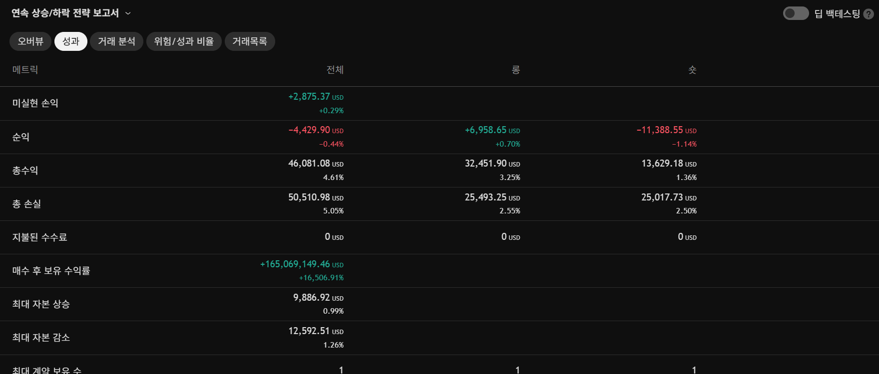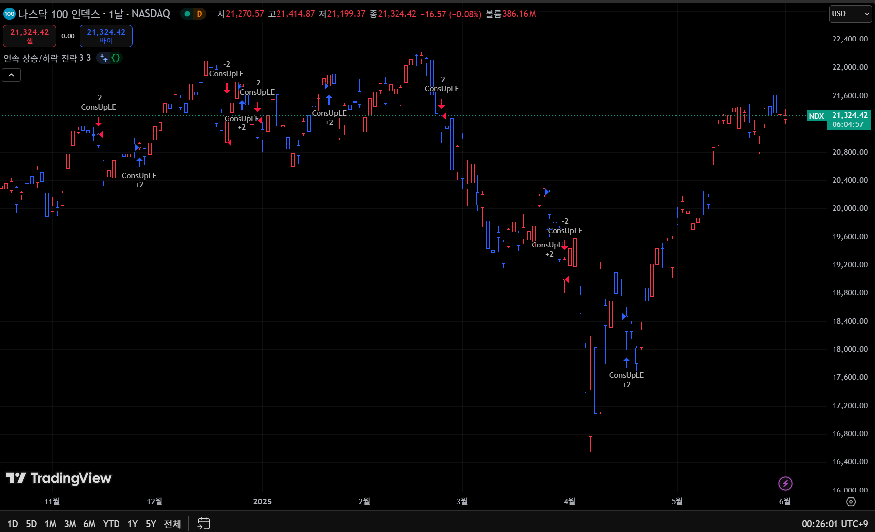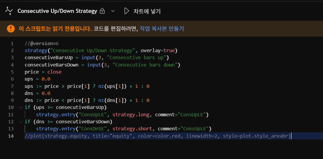 트레이딩뷰에서 사용되는 파인 스크립트(Pine Script)는 사용자가 직접 거래 전략을 코딩할 수 있게 해주는 프로그래밍 언어입니다. 연속 업/다운 전략의 코드를 차근차근 분석해보겠습니다