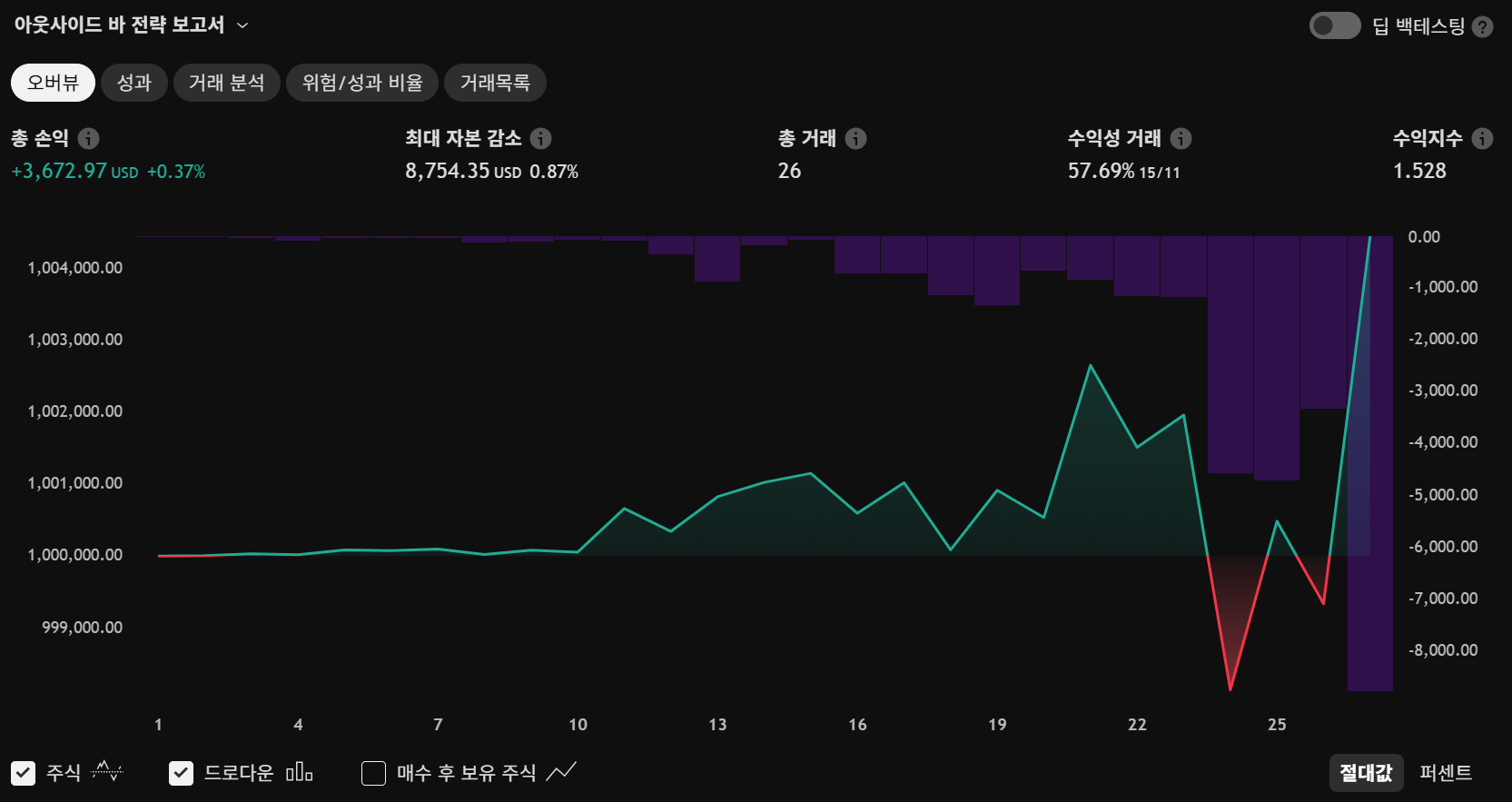아웃사이드 바 전략의 핵심 로직을 간결하게 구현했습니다. 버전 6을 사용하여 최신 문법과 기능을 활용하며, 전략 스크립트로 선언되어 백테스팅이 가능합니다