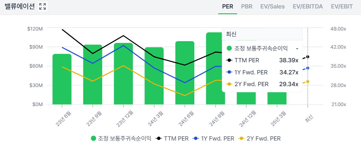 - Forward P/E: 34.9x (업계 평균 32.1x 대비 소폭 고평가)