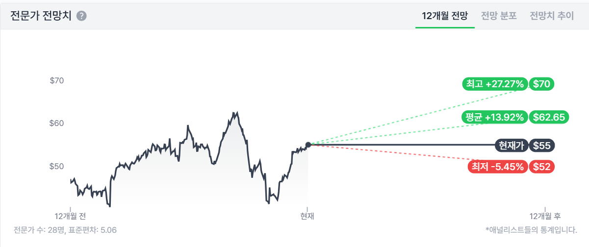 애널리스트 목표가는 평균 $63.69로 현재가 대비 15.8% 상승 여력을 시사합니다
