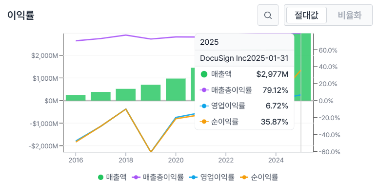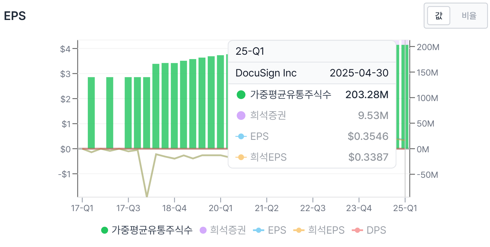 업종 평균(44.47배) 대비 30~50% 할인된 22~25배 수준에서 거래되고 있습니다. 이는 DocuSign의 성장성 둔화 우려가 이미 상당 부분 주가에 반영된 것으로 볼 수 있습니다