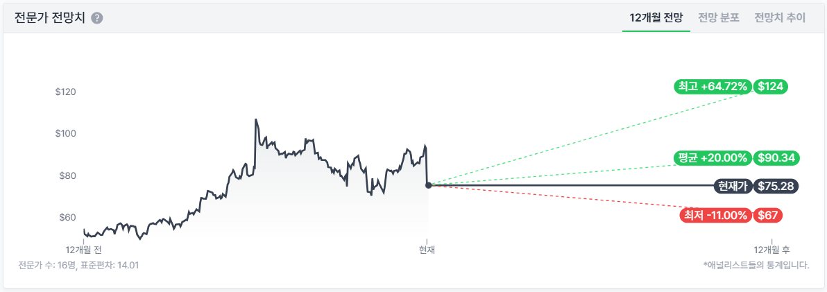 만약 업종 평균 P/E(44.47배)까지 재평가될 경우, 현행 EPS 기준으로 주가는 130~140달러까지 상승 여력이 있습니다. 보수적으로 1년 Forward P/E 25배만 적용해도 현행 주가(75.28달러) 대비 20~30%의 상승 여력이 존재합니다