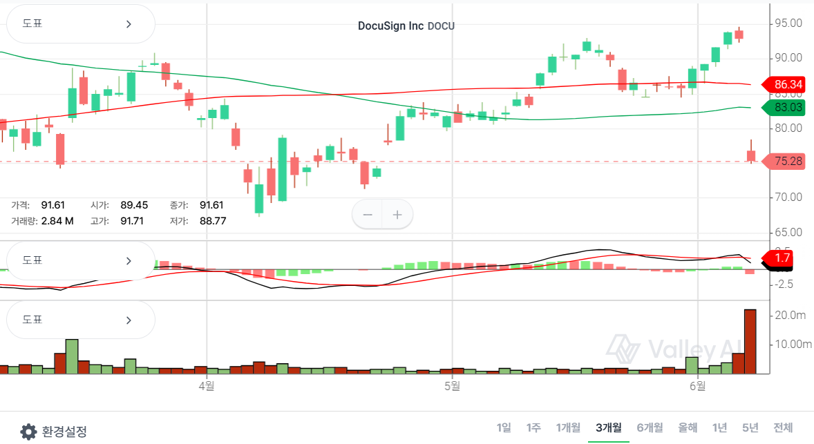 현재 DocuSign 주가는 75.28달러로, 52주 최고가 107.86달러 대비 30.2% 하락한 수준입니다