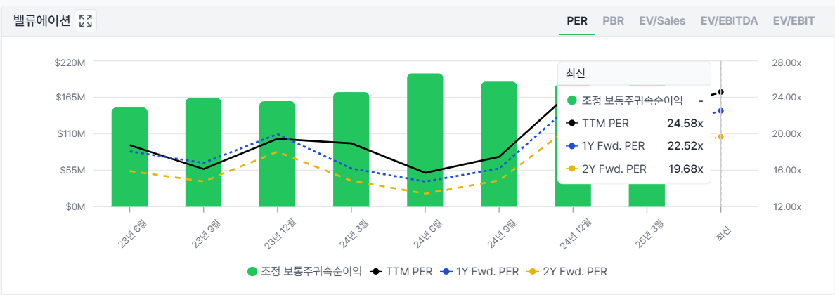 향후 1~2년간 이익 성장률이 유지된다면, 1년 Forward P/E 22.52배, 2년 Forward P/E 19.68배는 업계 내에서 매력적인 수준입니다