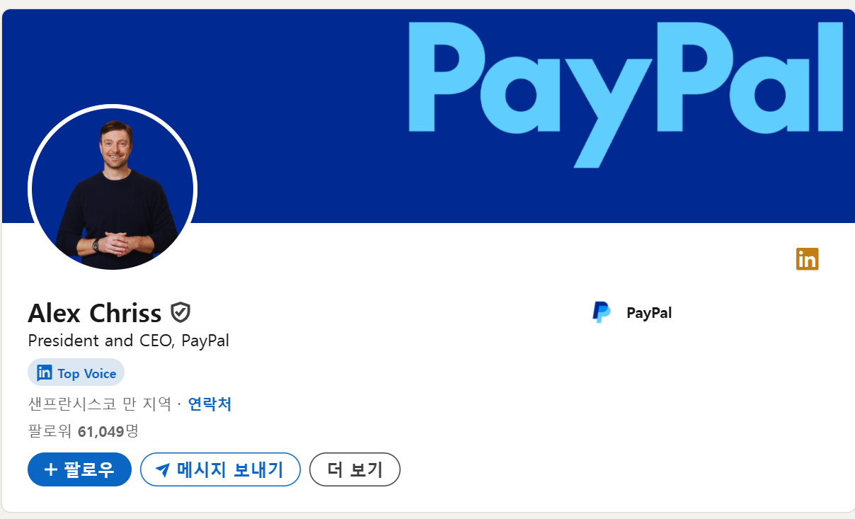 Alex Chriss CEO (2023년 9월 취임)Alex Chriss는 Intuit에서 20년간 근무한 경험을 바탕으로 PayPal의 전략적 전환을 이끌고 있습니다. 주요 성과로는 5분기 연속 수익성 성장 달성과 거래 마진 8% 증가를 기록했습니다
