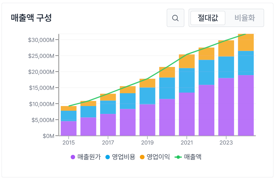 지속적인 매출 성장을 보여주고 있으나, 성장률이 둔화되는 추세입니다. 2024년 총 매출은 317.97억 달러로 전년 대비 6.7% 증가했으나, 2025년 1분기에는 성장률이 1.2%로 크게 둔화되었습니다