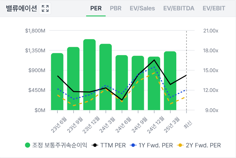 PayPal의 현재 P/E 14.98배는 주요 경쟁사인 Visa(34.46배), Mastercard(38.88배) 대비 크게 할인된 수준으로, 상당한 밸류에이션 매력을 보유하고 있습니다