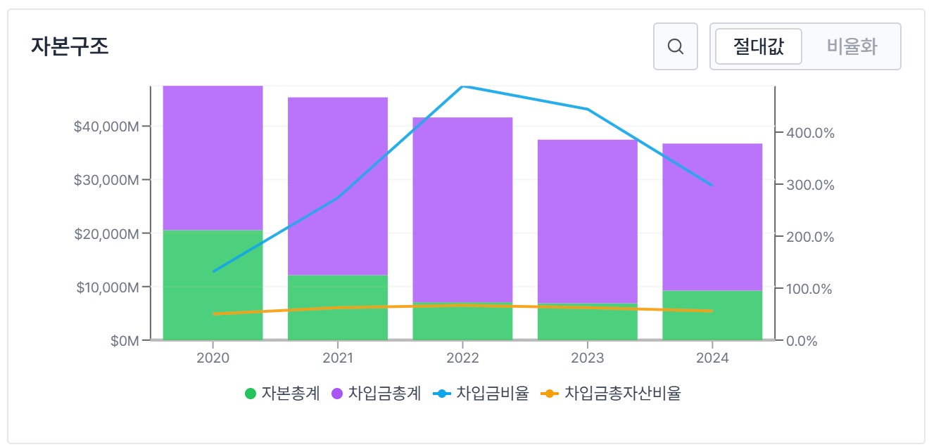 현금흐름표 분석에서 영업활동 현금흐름이 2024년 60억 달러에 근접하여 사상 최고치를 기록했습니다. 이는 강력한 현금 창출 능력을 보여주며, 부채 상환과 배당 재개를 위한 기반을 마련했습니다