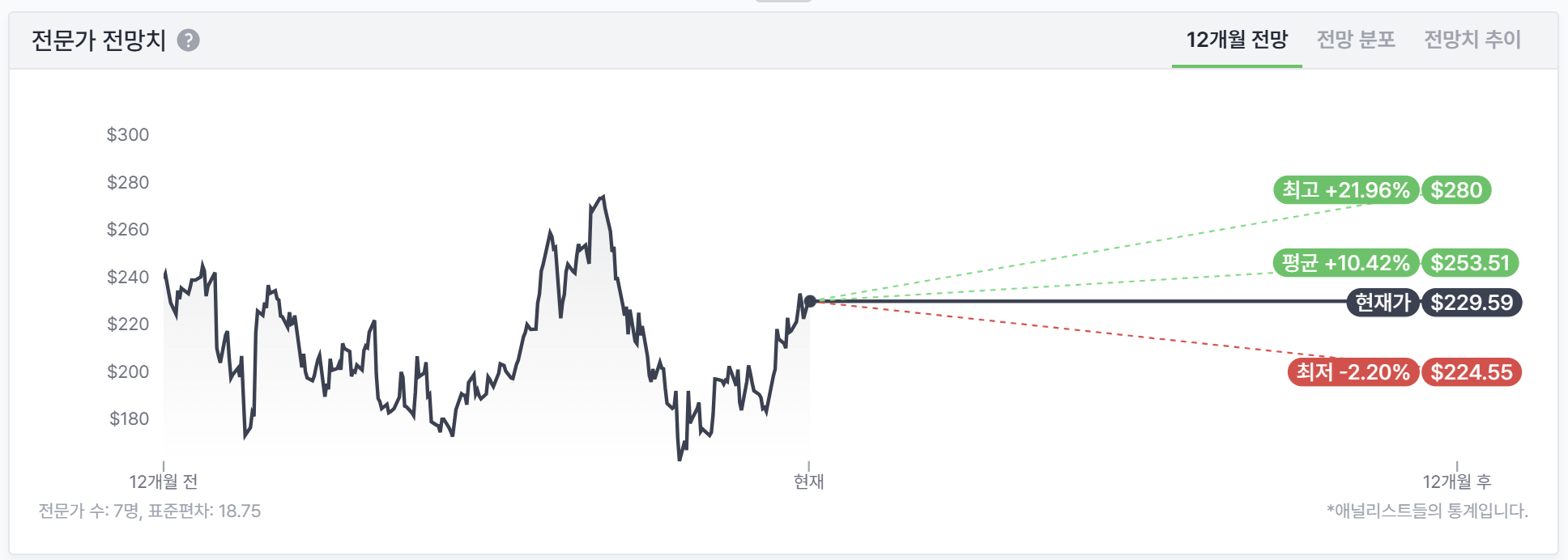 주요 증권사들의 목표주가는 $240-$280 범위에서 형성되어 있으며, 평균 목표주가는 $253입니다