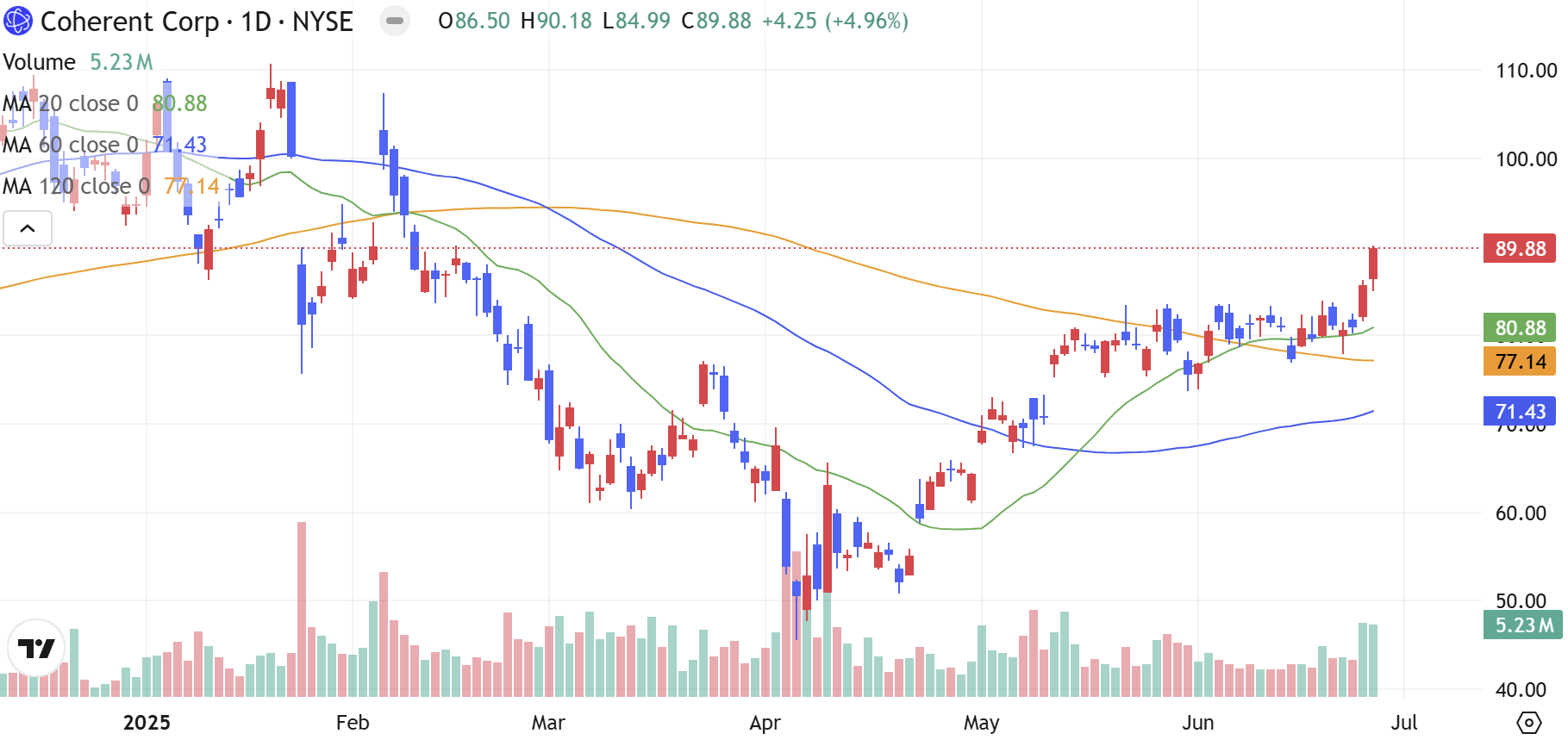 현재 Coherent Corp의 주가는 $85.63로 강력한 상승 추세를 보이고 있으며, 20일 이동평균선($80.30) 대비 6.6%, 50일 이동평균선($71.01) 대비 20.6% 상회하여 거래되고 있습니다