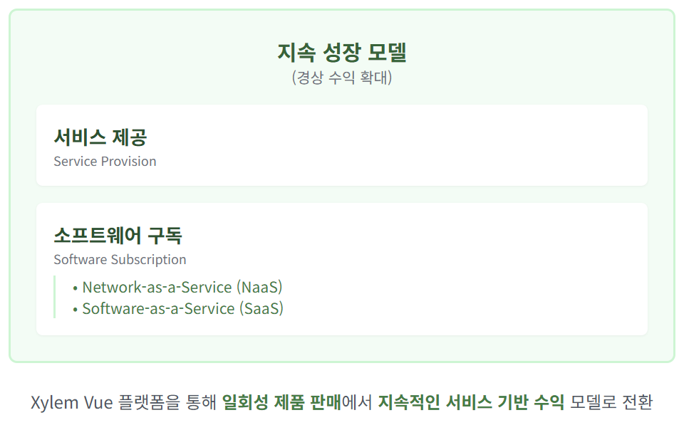 특히 Xylem Vue 플랫폼을 통한 서비스형 네트워크(Network-as-a-Service)와 서비스형 소프트웨어(Software-as-a-Service) 모델을 통해 경상 수익을 확대하고 있으며, 이는 기존의 일회성 제품 판매 모델에서 지속적인 수익 창출 모델로의 전환을 의미합니다