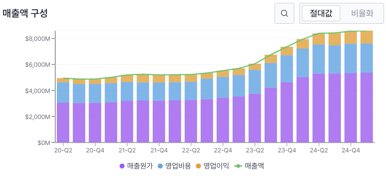 특히 주목할 점은 영업 마진이 12.5%로 전년 8.9% 대비 크게 개선되었다는 것입니다. 이는 인수 통합 효과와 운영 효율성 향상의 결과로 해석됩니다. 순 마진 역시 10.4%로 전년 8.3% 대비 상승하여 전반적인 수익성 지표가 개선되는 추세를 보이고 있습니다