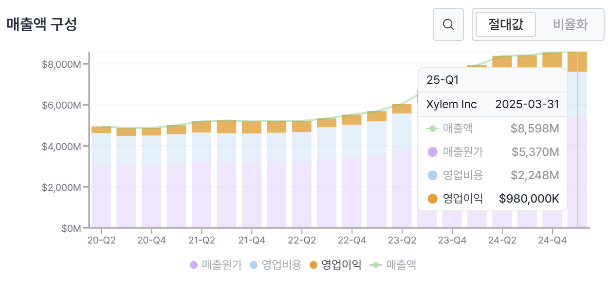 Xylem Inc 5년간 재무 성과 분석 - 매출, 순이익, 수익성 지표 추이