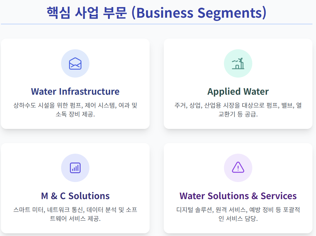 주요 경쟁사인 Pentair는 산업용 솔루션에, Grundfos는 펌프 기술과 에너지 효율성에, Veolia와 Suez는 각각 통합 서비스와 운영 전문성에 강점을 가지고 있습니다
