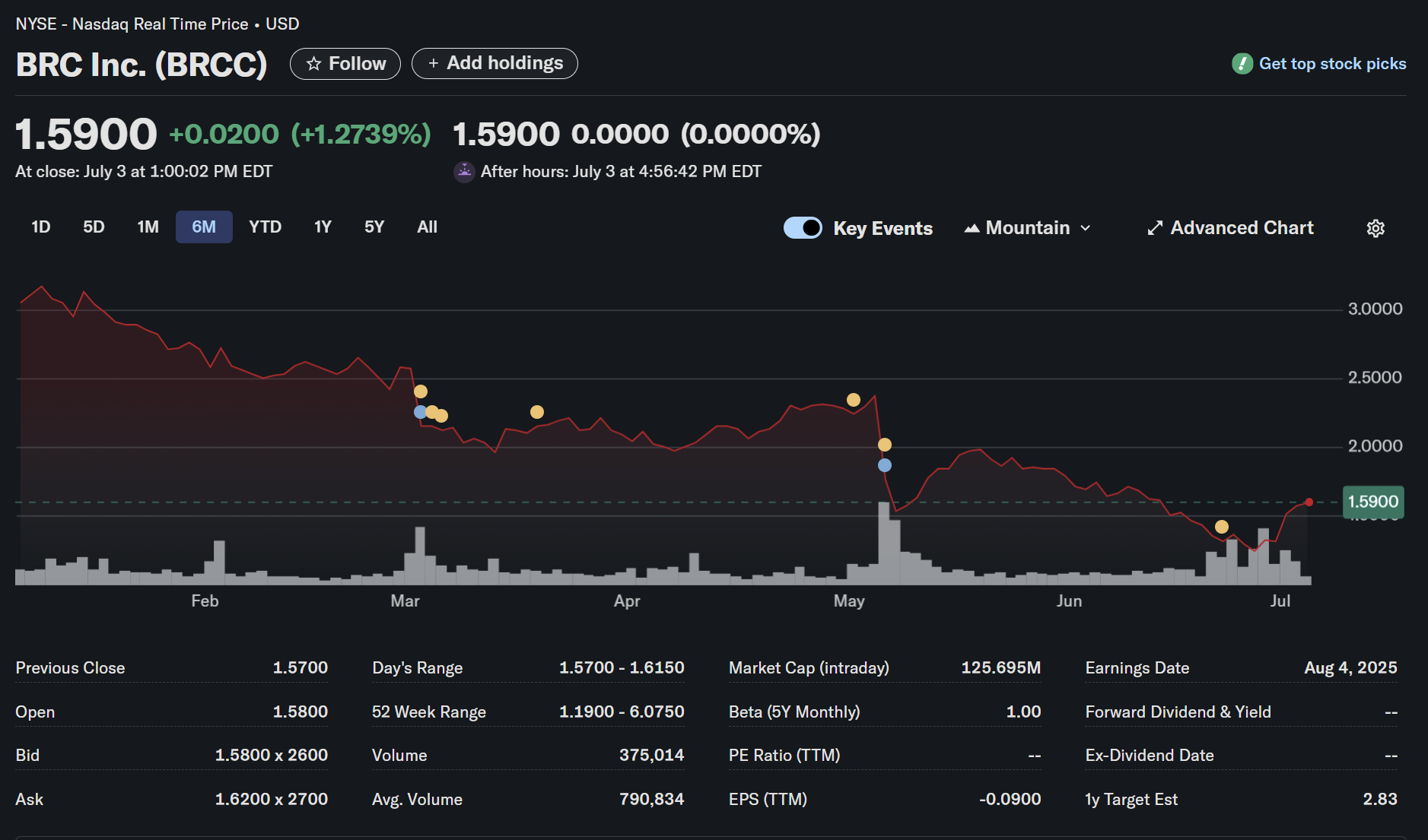 BRC Inc. (NYSE: BRCC), known as Black Rifle Coffee Company, represents a unique consumer staples investment focused on premium coffee and veteran community support^12. Trading at $1.59 per share with a $340 million market cap, BRCC has built a distinctive brand around supporting military veterans and first responders