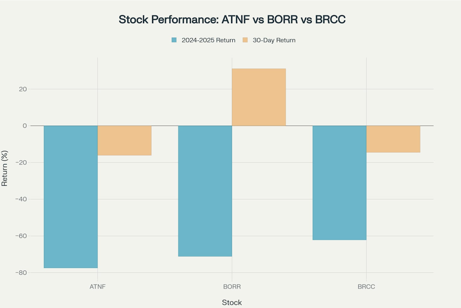 Stock Performance Comparison showing both annual and recent monthly returns for ATNF, BORR, and BRCC stocks
