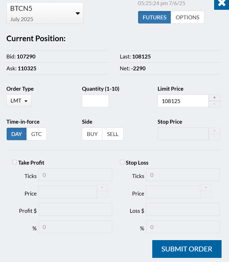 예를 들어, 비트코인 가격이 5달러 오르면 1개 계약당 25달러의 수익(또는 손실)이 발생합니다.