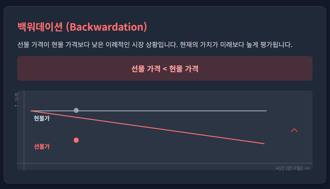 선물가격이 현물가격보다 낮은 상태를 의미합니다. 현재 즉시 구매하는 것이 미래에 인도받는 것보다 더 비싼 상황입니다.