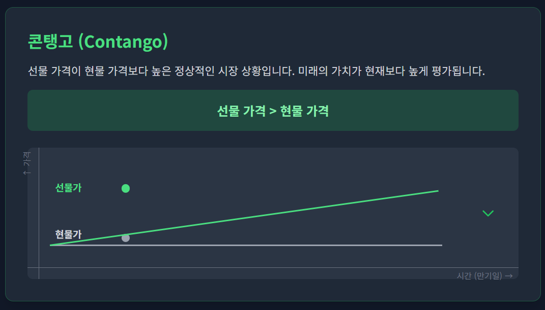 선물가격이 현물가격보다 높은 상태를 말합니다. 즉, 미래에 인도받을 상품의 가격이 현재 즉시 구매할 수 있는 상품의 가격보다 비싼 상황입니다.