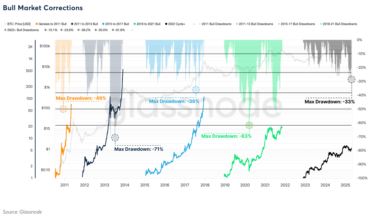 드로우다운(Drawdown, 고점 대비 하락률)도 과거와 다른 양상을 보입니다. 현재 사이클에서는 대부분의 조정이 -25% 이내에서 그치고 있으며, -30%를 넘는 경우는 단 두 차례에 불과합니다.