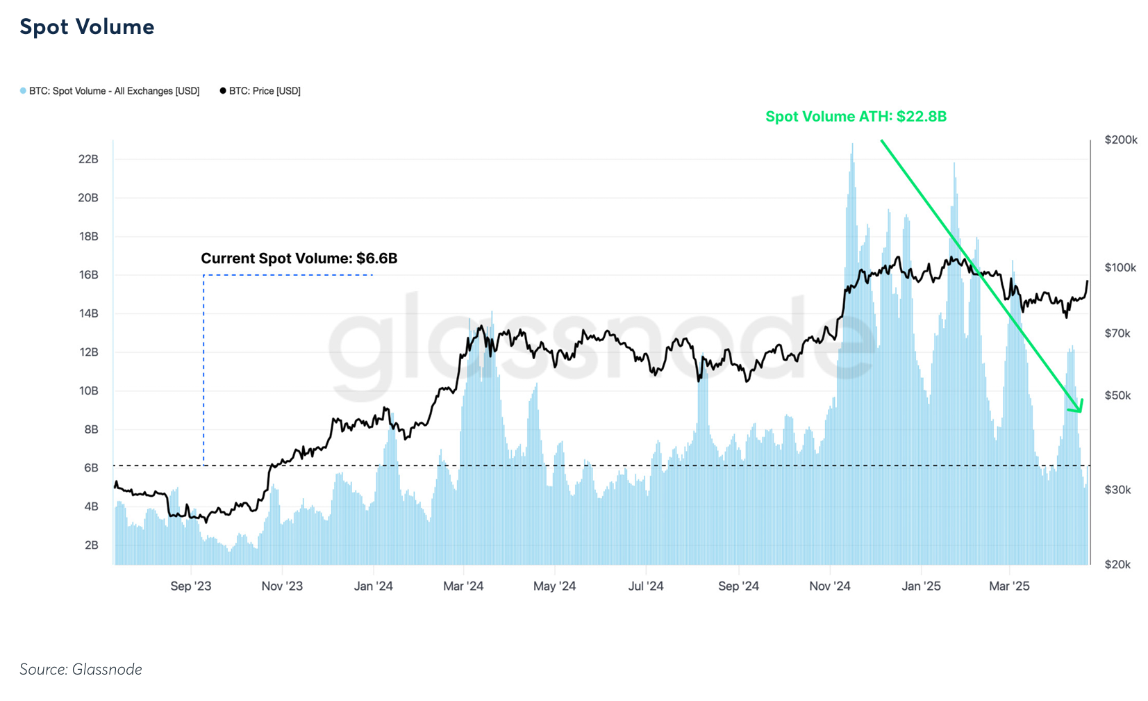 현재 비트코인 시장은 흥미로운 교차점에 서 있습니다. 현물 거래량이 $228억에서 $66억으로 71% 감소하는 등 전반적인 거래 활동이 위축되고 있습니다.