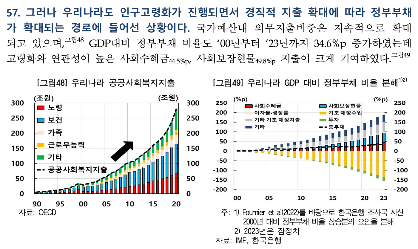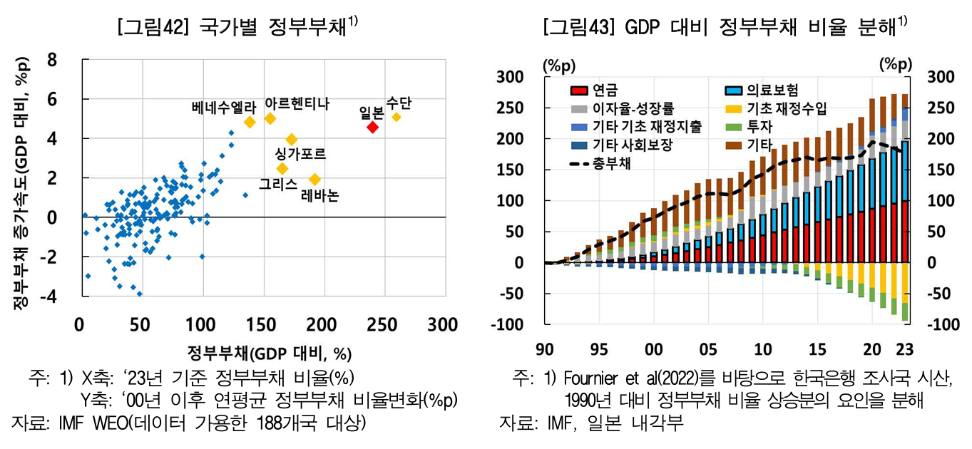 일본 부채 폭증의 결정타는 경기부양이 아니라 연금·의료 지출이었습니다. 1990‒2023년 정부부채 /GDP 비율 증가분 중 95% 이상이 사회보장비 때문이었죠.