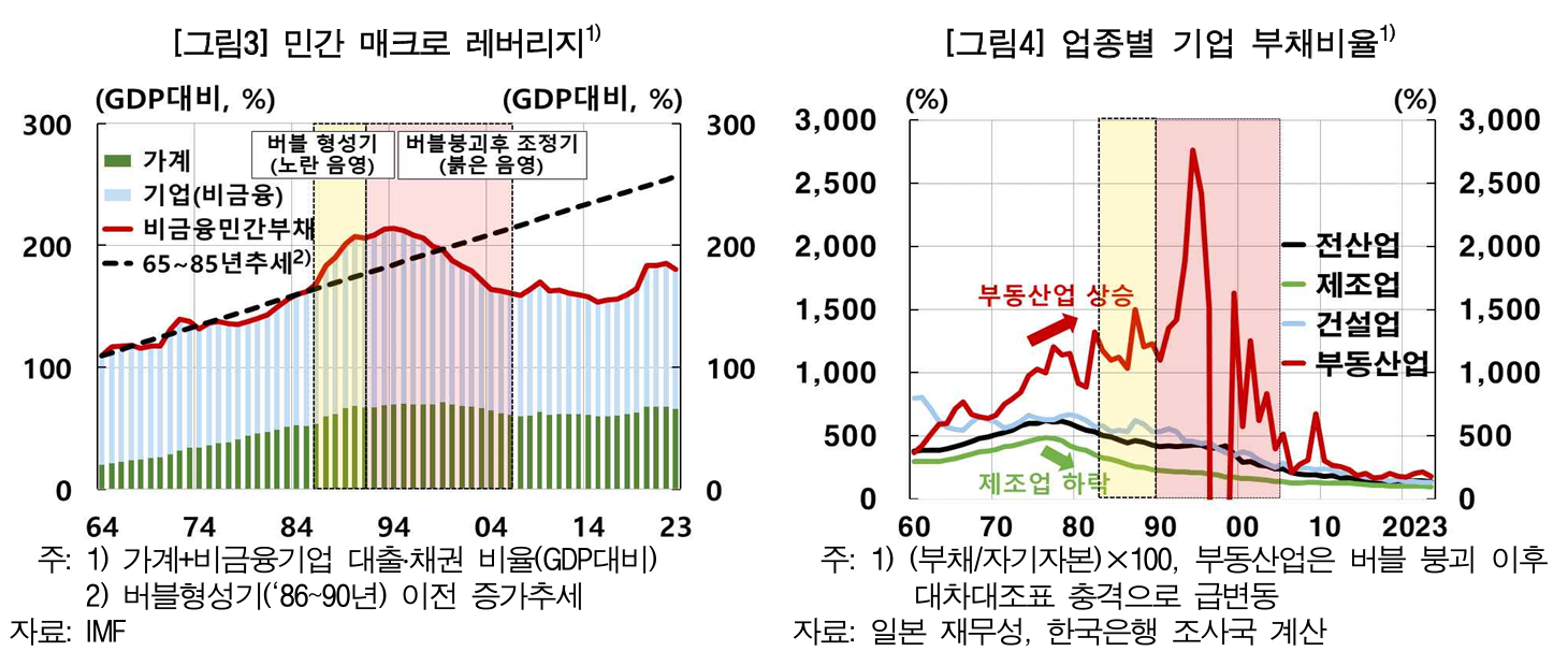 버블 당시 일본의 민간 레버리지(가계·기업 부채/ GDP) 는 214%까지 치솟았습니다. 사전 규제가 부실했고, 붕괴 후 정리도 지체돼 은행위기로 번졌죠.