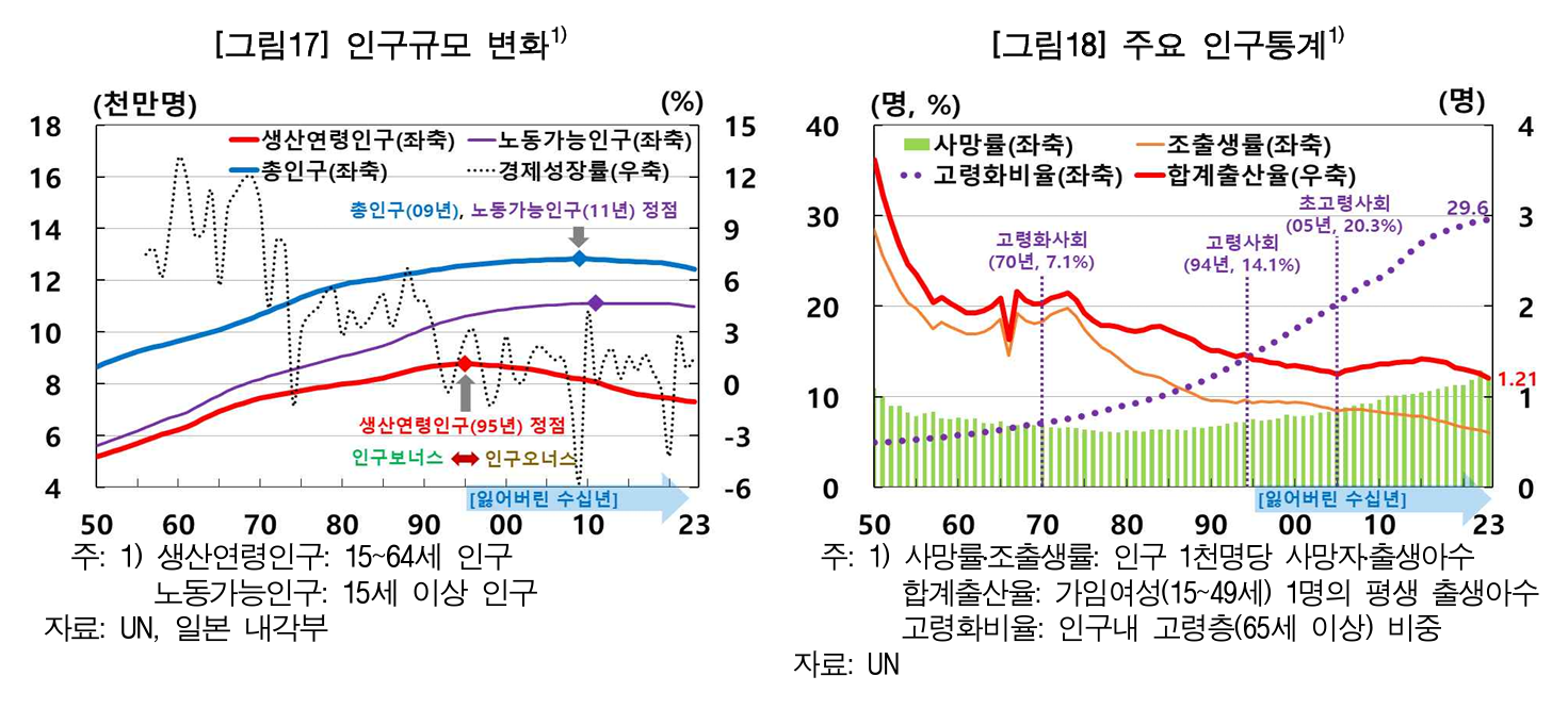 일본은 1995년 생산연령인구가 정점에 이르렀고 2005년 초고령사회(65세 이상 비중 20%) 로 들어섰습니다. 노동투입이 줄면서 잠재성장률 기여도가 음(–)으로 전환됐죠.