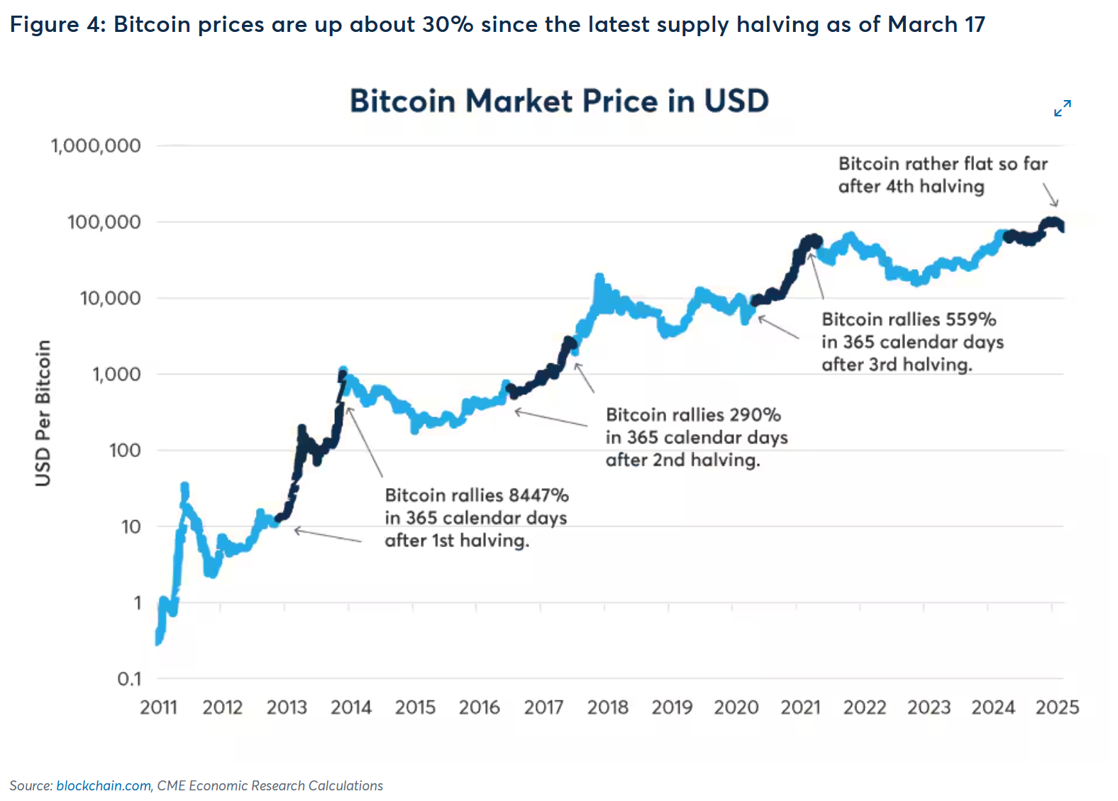 과거에는 반감기 이후 비트코인 가격이 수백 퍼센트에서 수천 퍼센트까지 상승하는 엄청난 랠리가 있었습니다^1. 하지만 이번에는 다릅니다. 반감기 이후 약 30% 상승에 그쳤으며, 이는 과거에 비해 상당히 온건한 수준입니다^1.