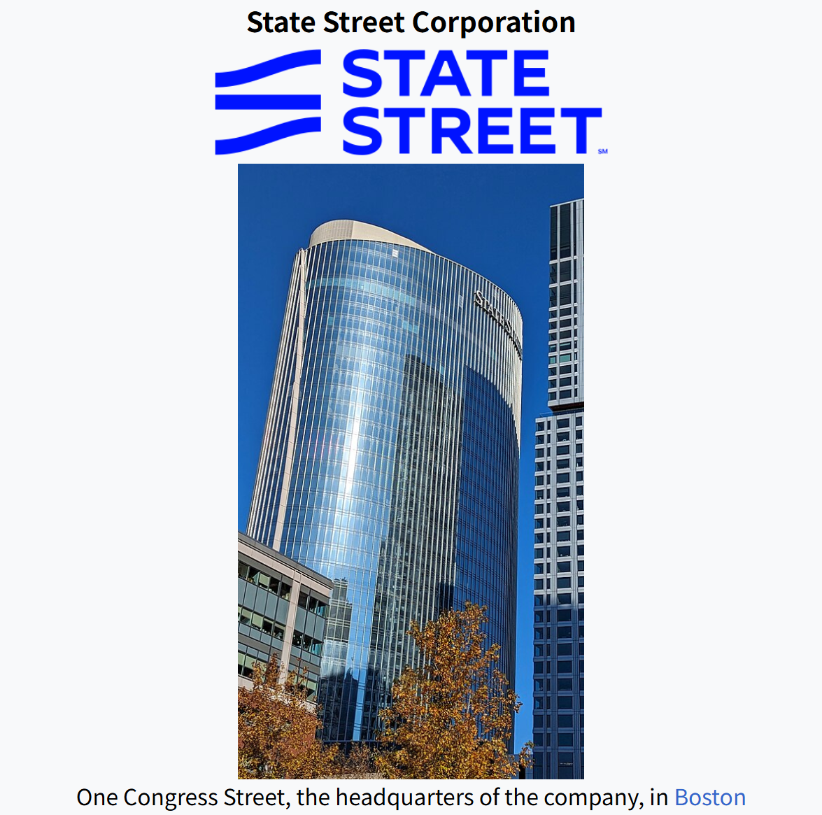State Street Corporation은 1792년 설립된 미국의 금융 서비스 대기업으로, 보스턴에 본사를 두고 있습니다^1.