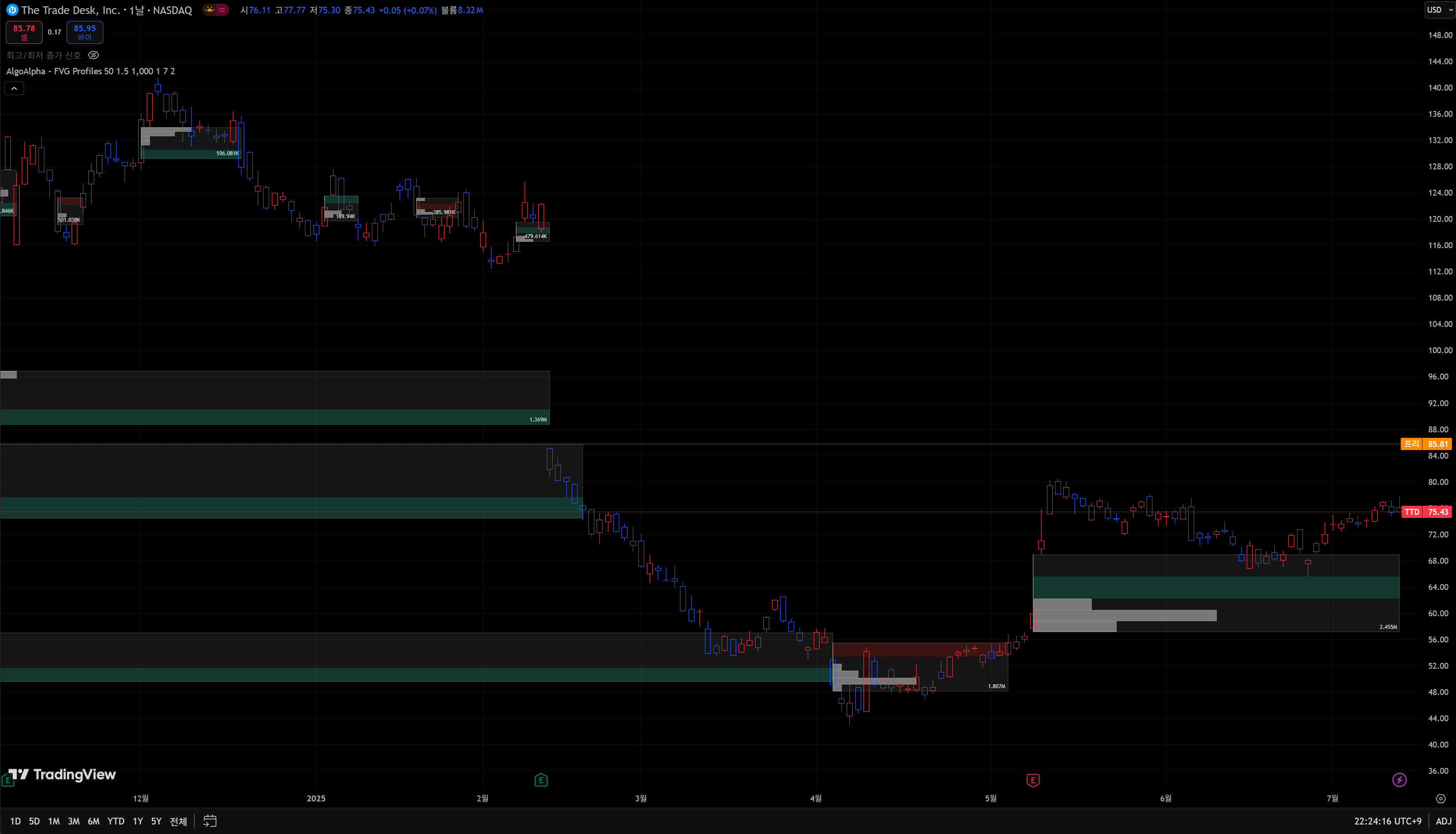 2025년 7월 중순 기준 TTD 주가 차트를 분석해 보니, 주가는 약 $75 수준에서 거래되고 있어요^8. 50일 이동평균선(약 $72)이 200일 이동평균선(약 $78)을 상향 돌파하려는 골든 크로스 패턴이 관찰되며, 이는 중기 상승 추세를 시사합니다^8.