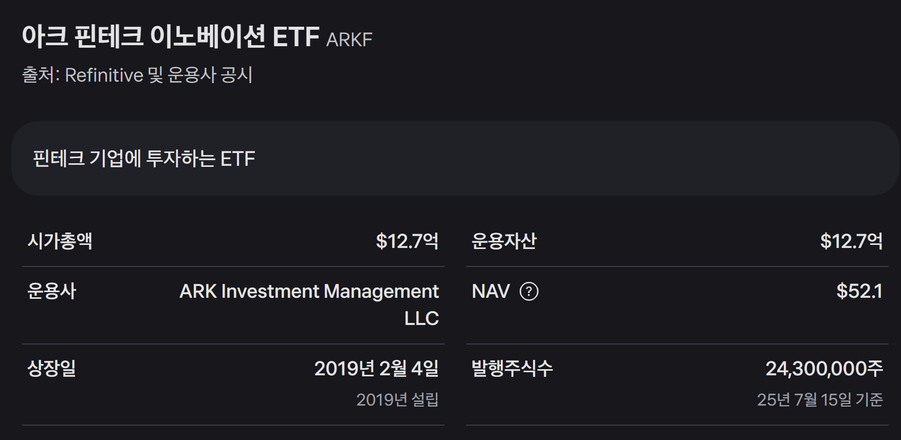 ARKF는 핀테크(Fintech: 금융과 기술의 결합) 분야에 특화된 ETF로, 디지털 결제, 블록체인(분산 원장 기술로 암호화폐 기반), 온라인 뱅킹 등 금융 혁신 기업을 타깃으로 합니다. 운용자금은 약 12억 달러로, 안정적인 규모를 자랑해요.