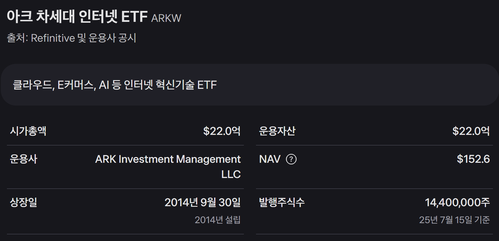 ARKW는 차세대 인터넷 기술에 투자하는 ETF로, 클라우드 컴퓨팅(인터넷 기반 데이터 저장 및 처리 기술), 빅데이터(대량 데이터 분석), 사물인터넷(IoT: 기기 간 연결 기술) 등 디지털 혁신 기업에 집중합니다.