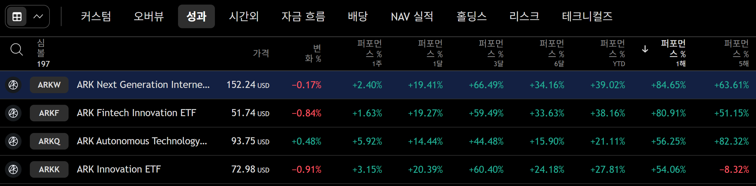이 네 ETF는 모두 ARK Invest의 액티브 관리 전략으로 운영되며, 공통적으로 기술 혁신에 베팅합니다.