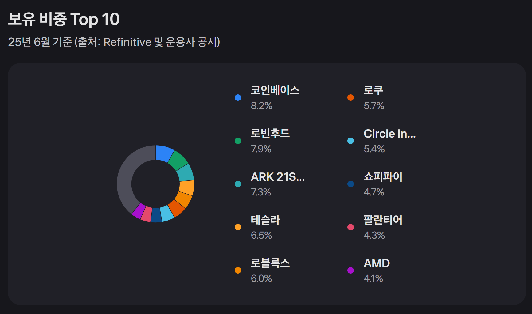 ARKF는 핀테크(Fintech: 금융과 기술의 결합) 분야에 특화된 ETF로, 디지털 결제, 블록체인(분산 원장 기술로 암호화폐 기반), 온라인 뱅킹 등 금융 혁신 기업을 타깃으로 합니다. 운용자금은 약 12억 달러로, 안정적인 규모를 자랑해요.